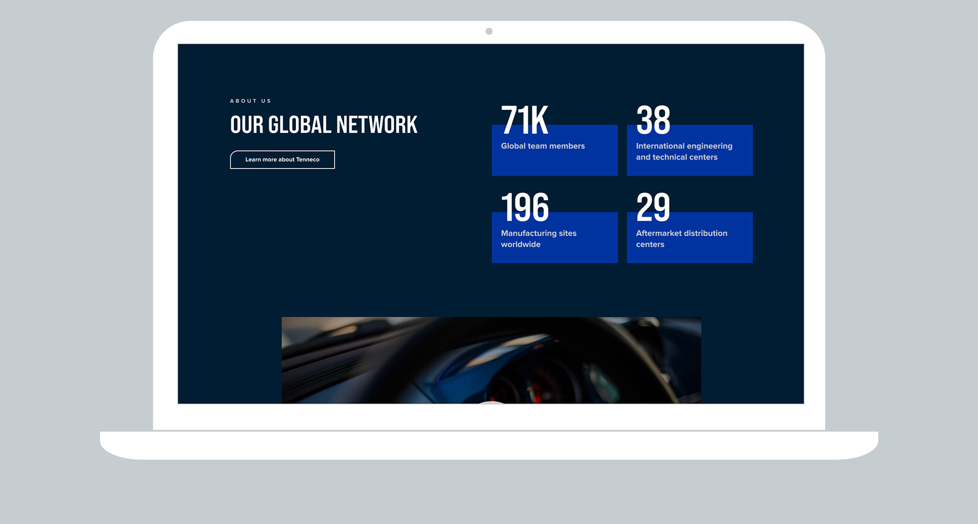 When designing the initial visual designs, it was important to express the idea of a forward thinking company and feature simplicity and clarity of messaging. I added a subtle nod to the shape of the "T" in the Tenneco logo by incorporating a single rounded corner in both card shapes and buttons. And although the primary colours are deep and dark blues and greys, I used some of the secondary neon greens and blues to help call attention to CTAs and add vibrancy without overwhelming the overall look and feel.